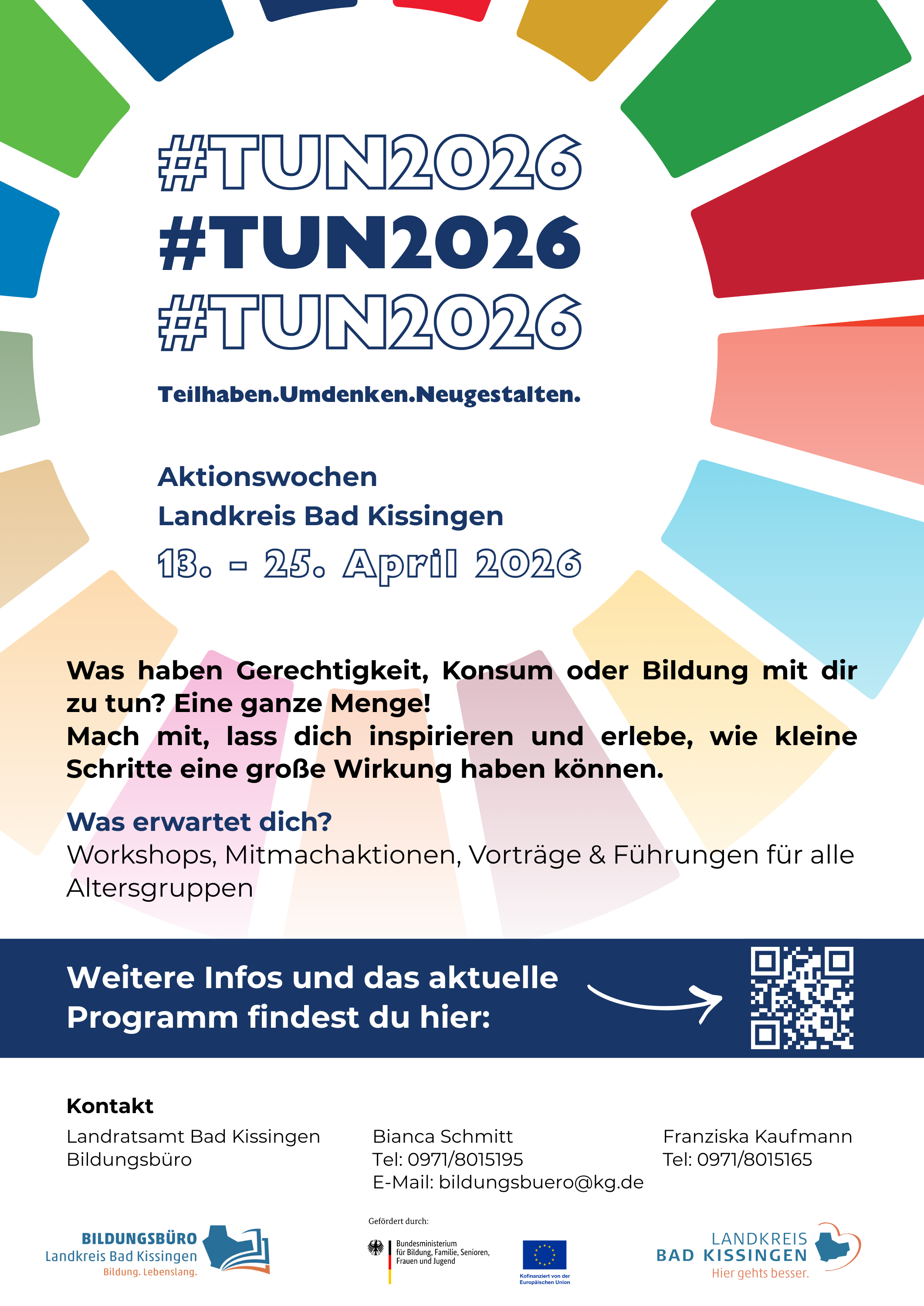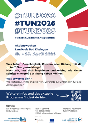 Unter dem Motto „#TUN2026 – Teilhaben.Umdenken.Neugestalten.“ laden wir Dich vom 13. bis 25. April 2026 ein, an den Aktionswochen des Landkreises Bad Kissingen teilzunehmen. Die Aktionswochen bringen Menschen, Ideen und Initiativen zusammen – für eine Region, die auch morgen lebenswert bleibt. Lass Dich inspirieren, mach mit und erlebe, wie kleine Schritte große Wirkung entfalten können. Ein Mehrwert, der bleibt. Gemeinsam mit Schulen, Vereinen, Initiativen, Kommunen, Unternehmen und engagierten Bürgerinnen und Bürgern haben wir vom Bildungsbüro des Landkreises ein abwechslungsreiches Programm für Groß und Klein zusammengestellt. Es zeigt, was im Landkreis Bad Kissingen bereits bewegt wird, macht Engagement sichtbar und eröffnet Dir neue Wege, selbst aktiv zu werden.